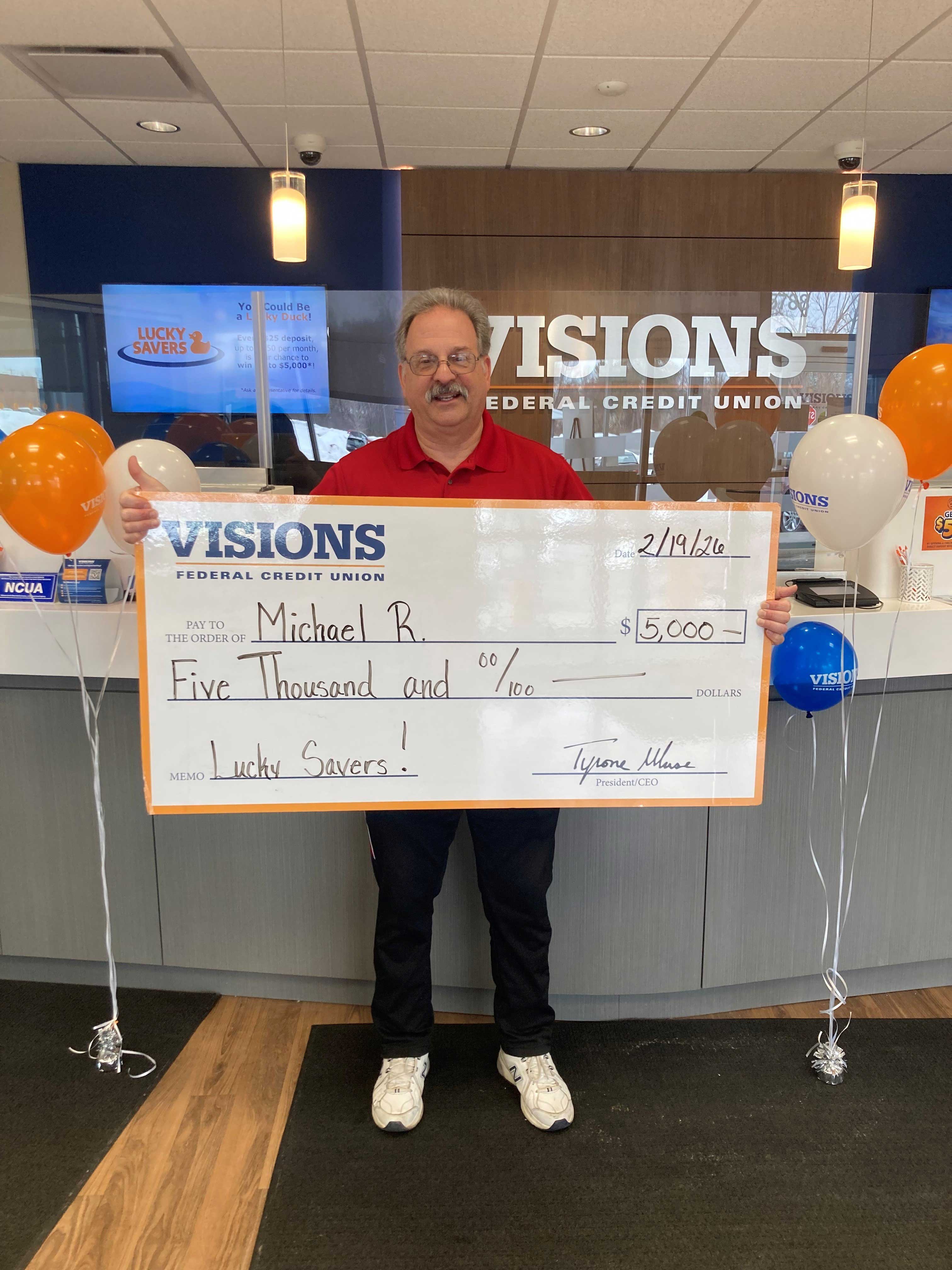 *APY = Annual Percentage Yield. Credit union membership required with a $1 minimum deposit – certain restrictions apply. Check with a Visions representative for eligibility details. Members must be 18 years of age or older. Must have valid U.S. Social Security number. Members cannot participate in the Lucky Savers program at more than (1) participating credit union. Accounts must be opened in a NJ, NY, or PA office or through our Contact Center at 800.242.2120. Void where prohibited by law. Official rules and a complete list of prizes are available at nycua.org or at any Visions location. Prize values are reportable for tax purposes. 12-month term. Visit visionsfcu.org/rates for current rate information. Federally insured by NCUA.